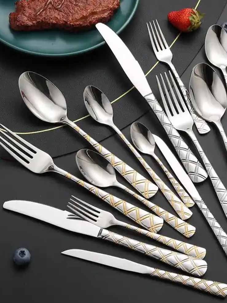 Nerūdijančio plieno stalo įrankių rinkinys – peilis, šakutė ir šaukštai. Esminės savybės: Tipas : Stalo įrankiaiKomplektai : Peilis, šakutė ir šaukštaiTaikymo sritys : Namai, kavinės, restoranai, viešbučiai, moteliai, valgyklos, picerijosDizaino…
